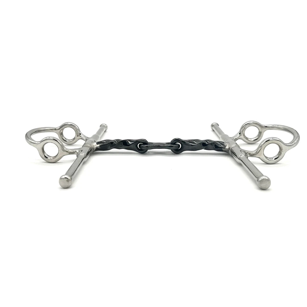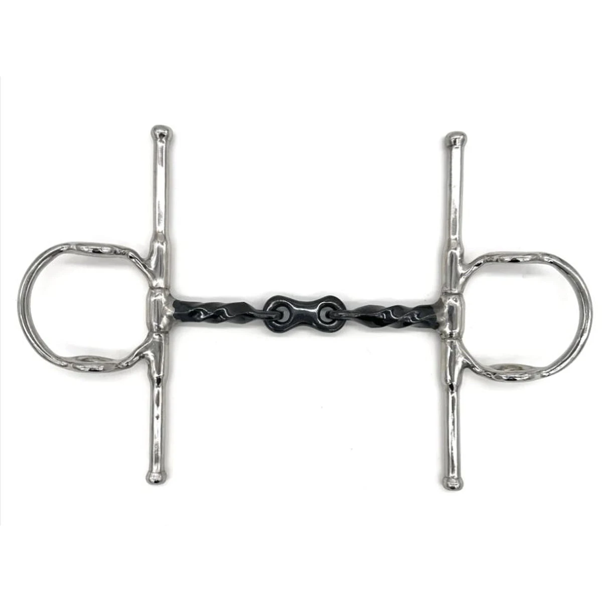 The two rein option will allow the rider to have varying degrees of control and be able to differentiate between the snaffle rein and the running cheek rein that provides poll pressure. The gentle twist provides extra control while the center French link softens the strength of the bit. The sweet iron encourages salivation and acceptance of the bit.