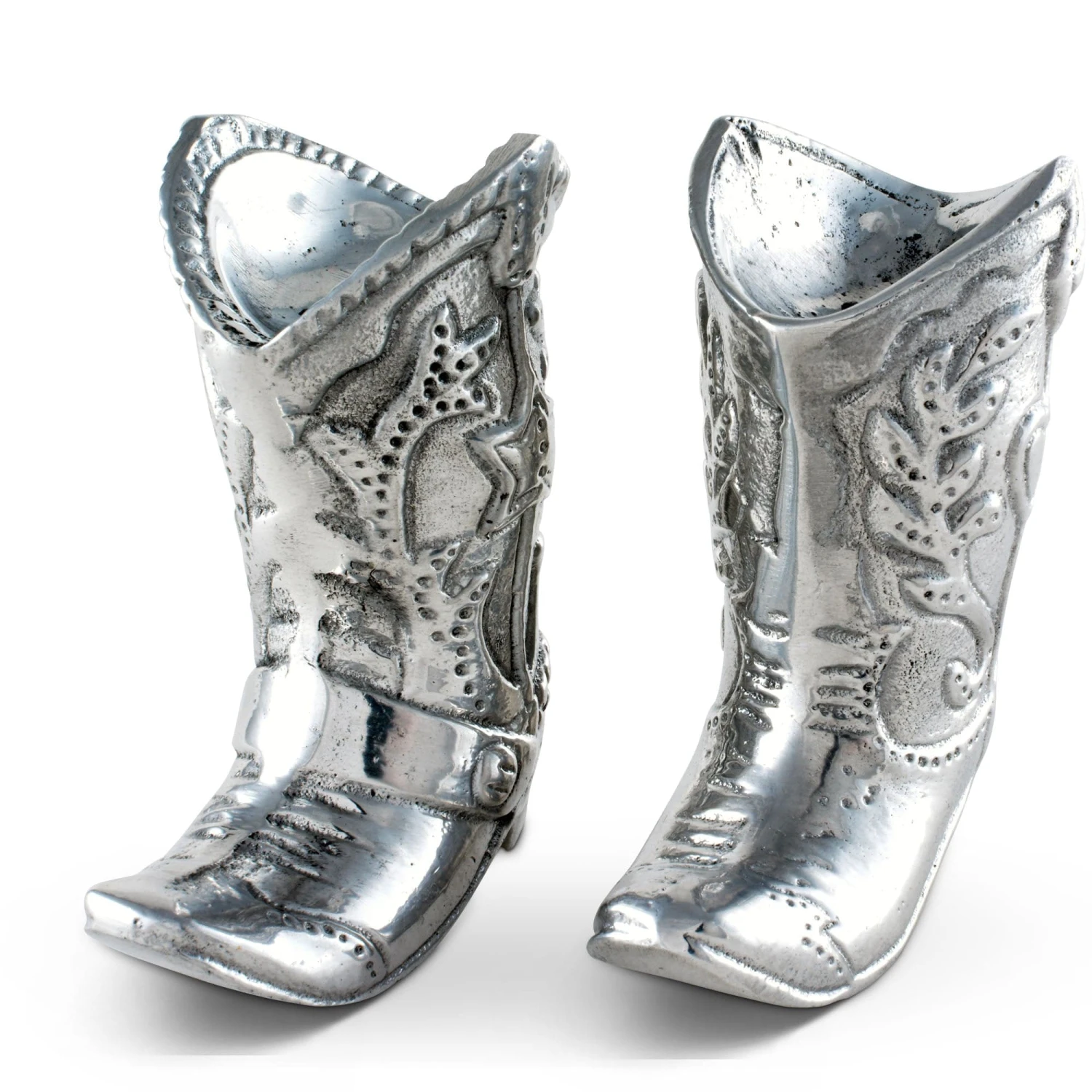 This Arthur Court Cowboy Boot Salt and Pepper Set is a perfect addition to any Western-themed kitchen. Crafted with intricate details, including stars, hearts, and a realistic spur and strap, this handmade, aluminum set adds a touch of rustic charm to your dining table.Â