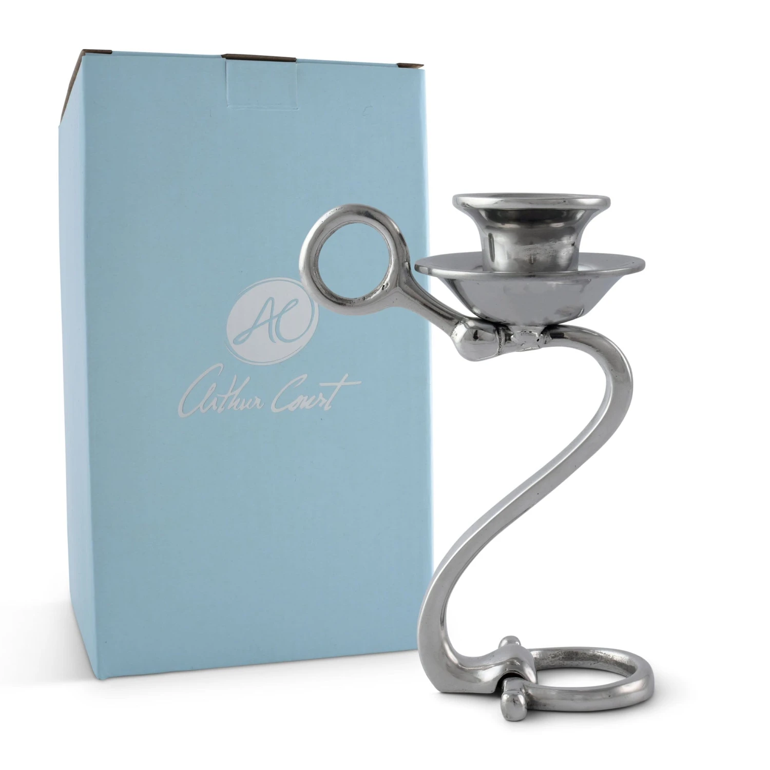 Expertly crafted with aluminum in a refined antique design, the Arthur Court Equestrian Bit Single Candlestick adds sophistication to any living space. Perfect for equestrian enthusiasts, this candlestick elevates and illuminates with a wax catcher to protect surfaces.Â