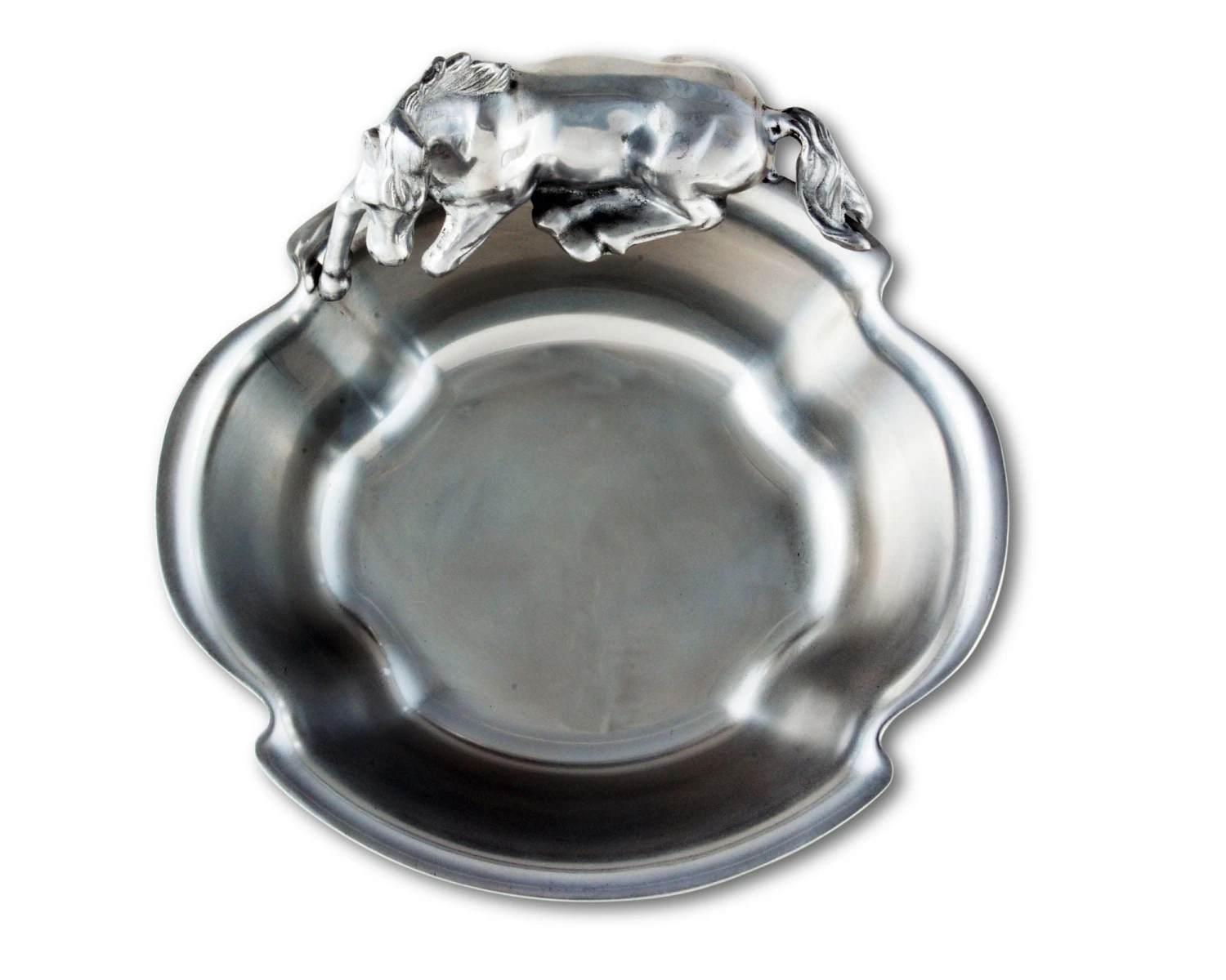 A beautifully detailed stallion sits along one edge of this piece as it waits patiently for the food to arrive. The horse’s friendly demeanor gives life to the design, while the slightly flared sides of this handmade, aluminum bowl make it easily transportable.