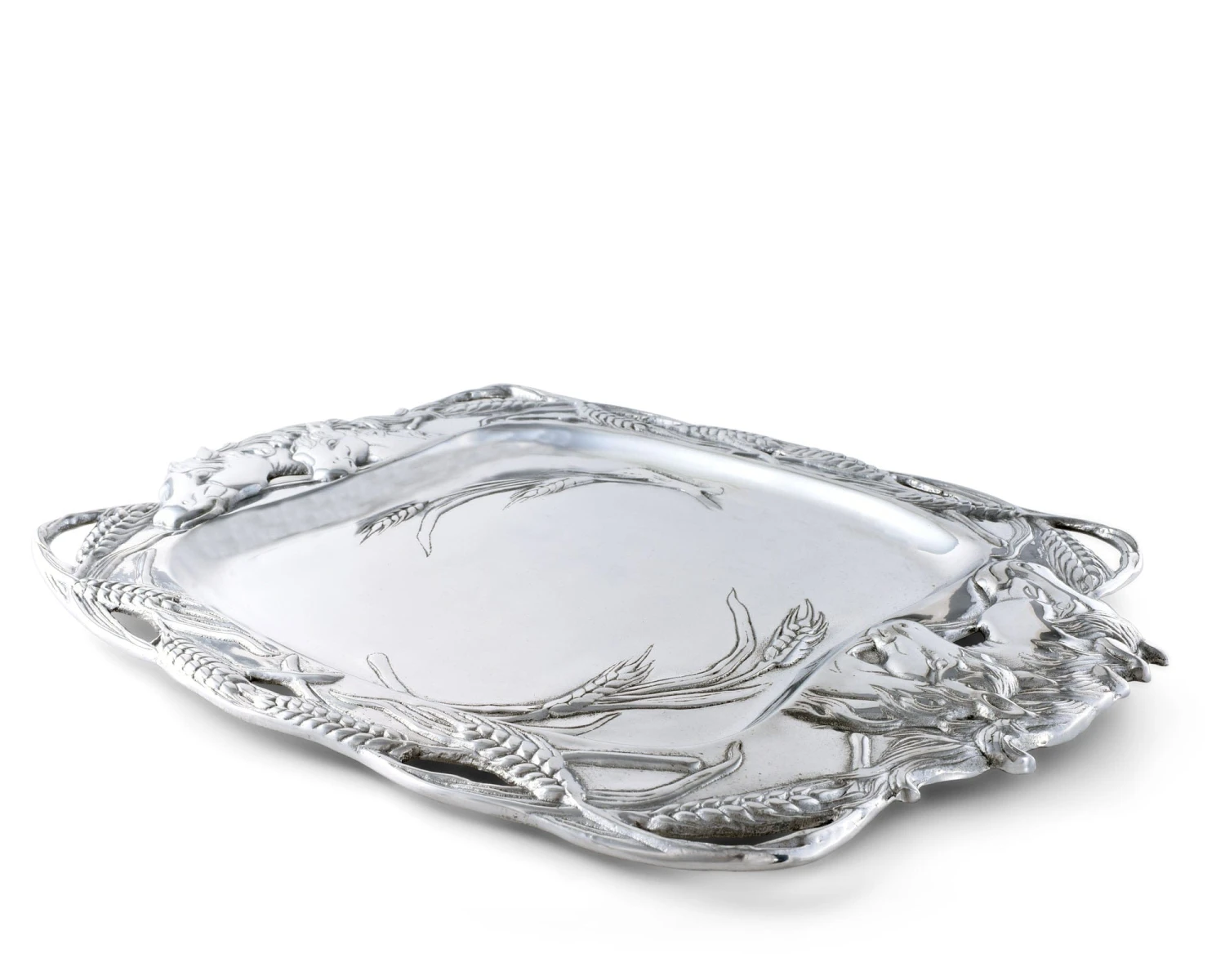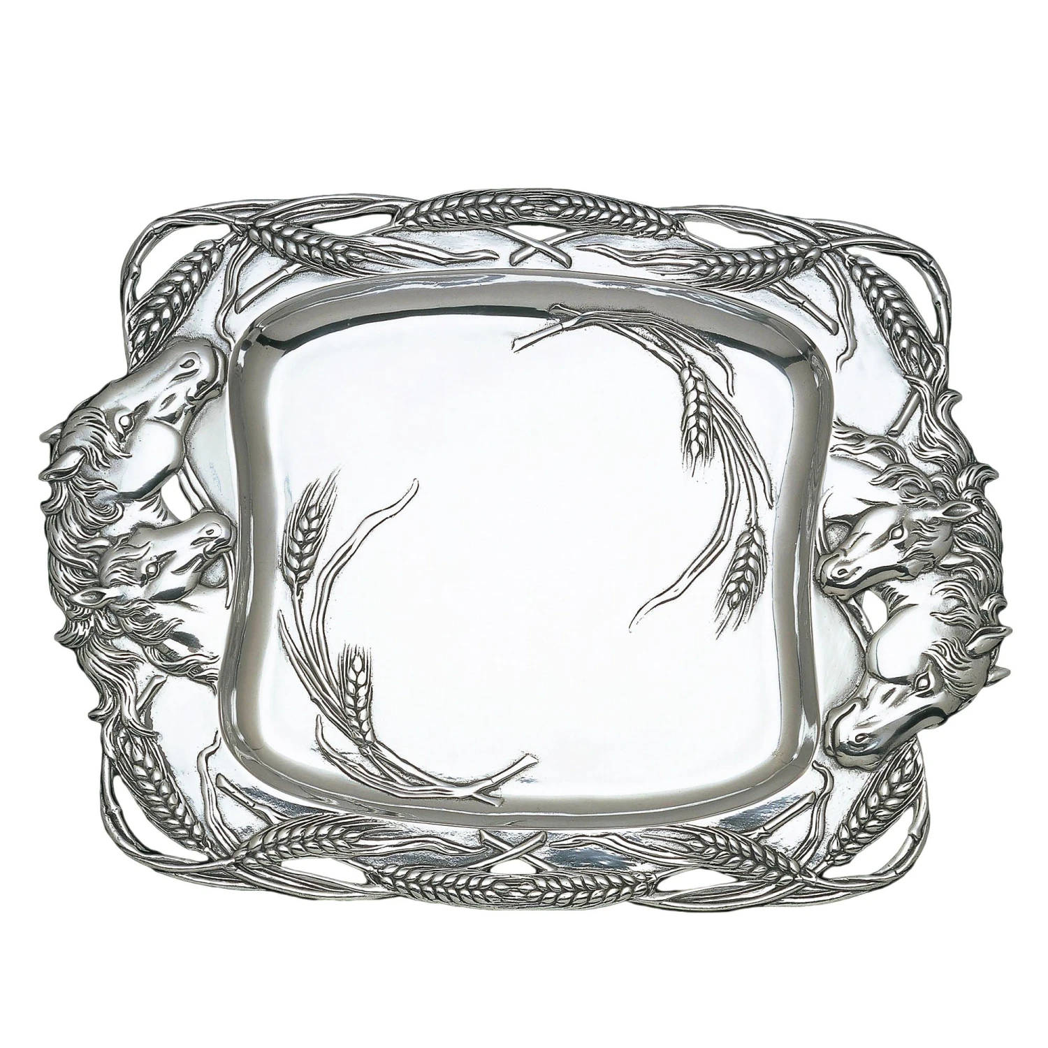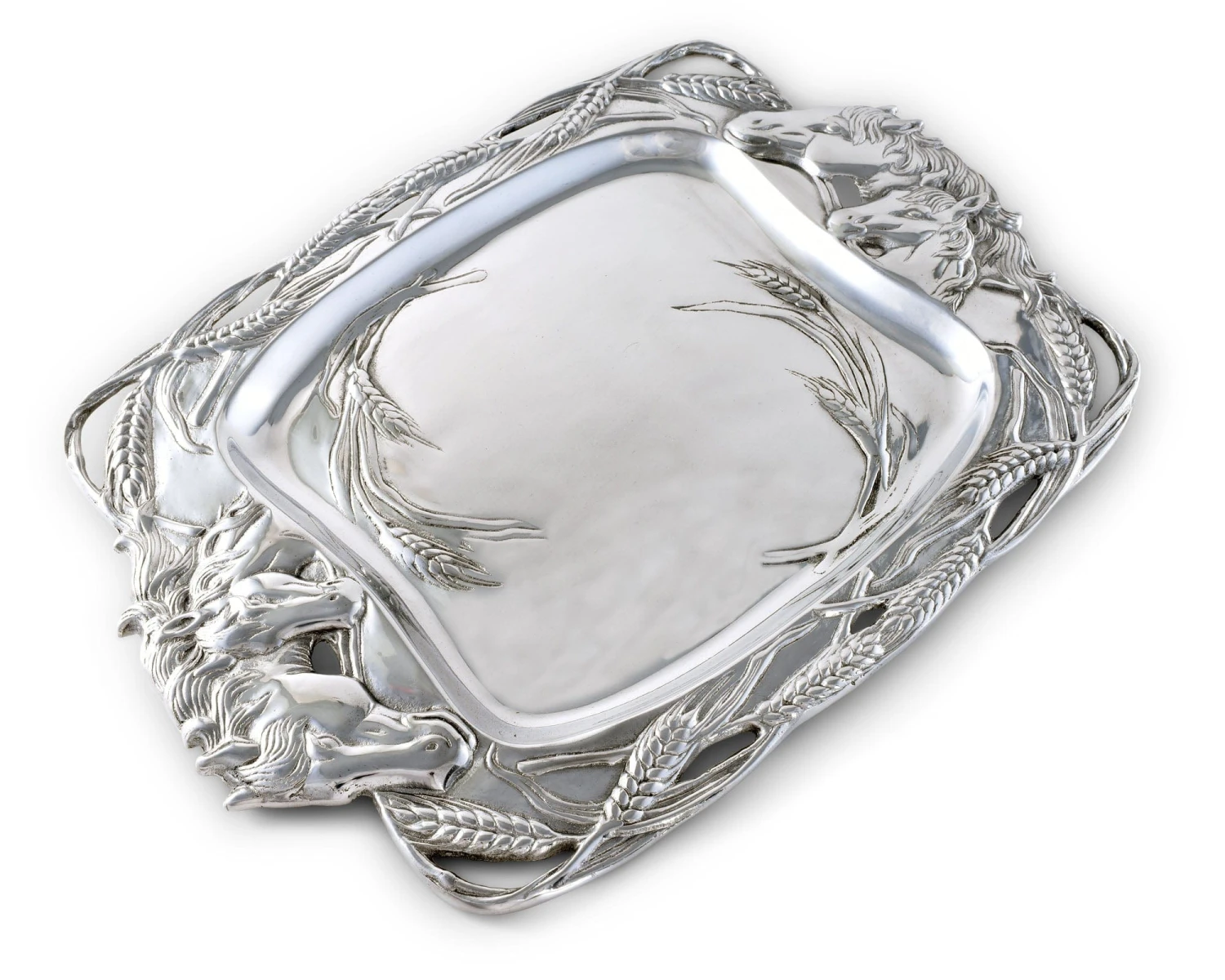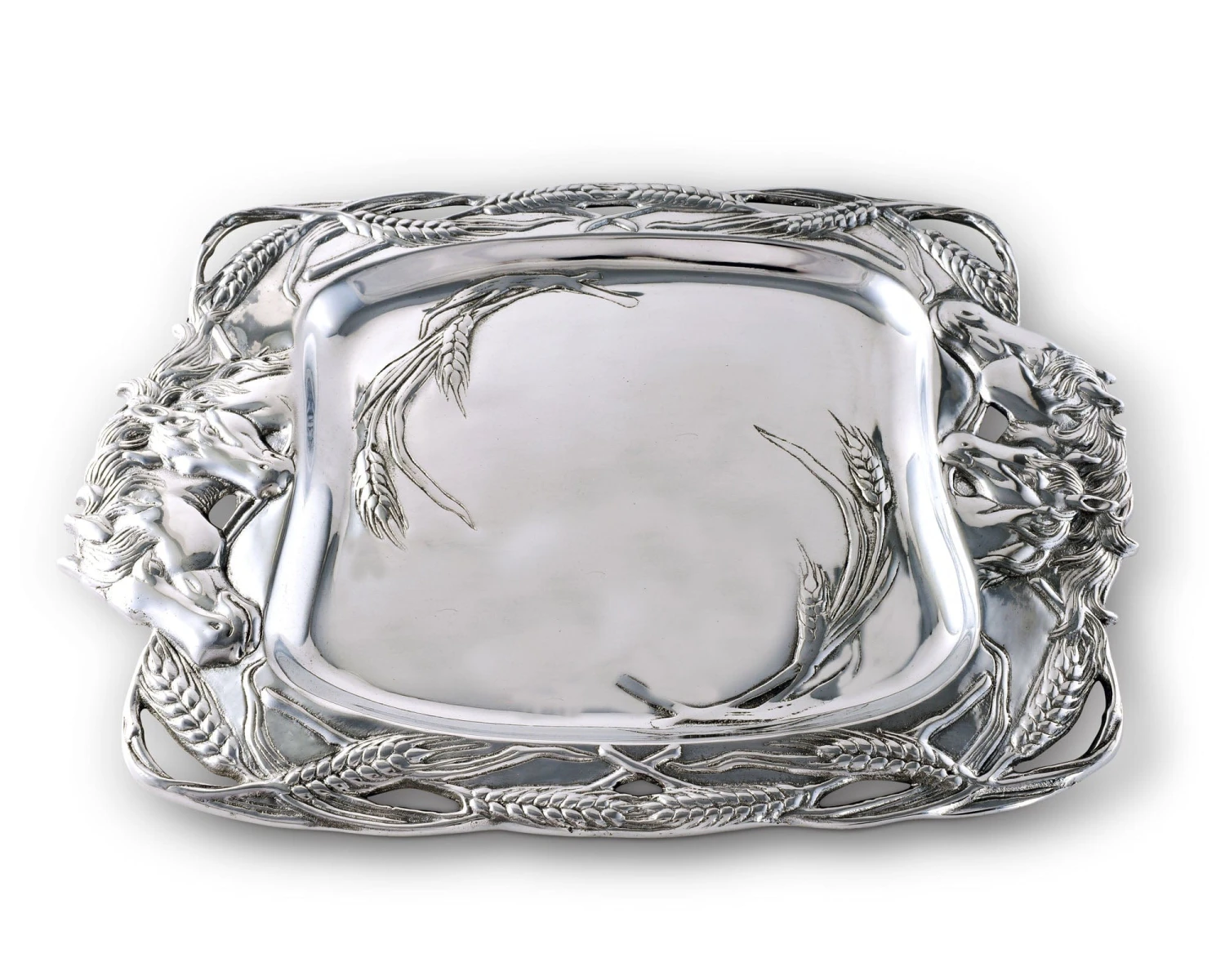 Groups of stallions mingle on either side of this handmade, aluminum dish as stalks of wheat form an openwork border around them. The incredible definition and detail within each design is both tangible and visible.