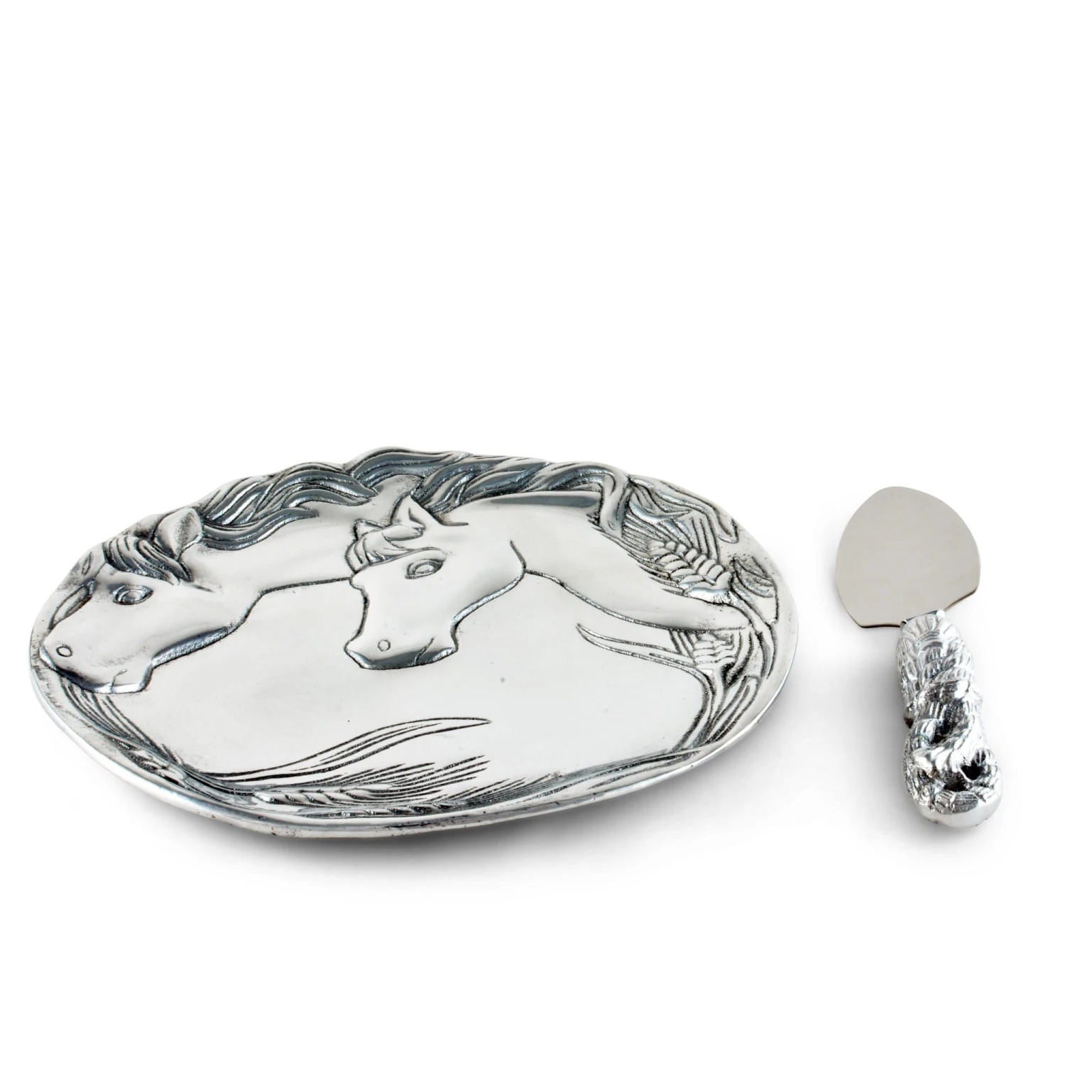 Arthur Court’s Horse Plate with Server is an unexpectedly artsy gift for your favorite equestrian, even if the horse lover is you. Sand-cast aluminum plate is an artwork of 2 detailed horse heads, finished with a wheat stalk border. Comes with triangle head server, the handle imagined as rope.