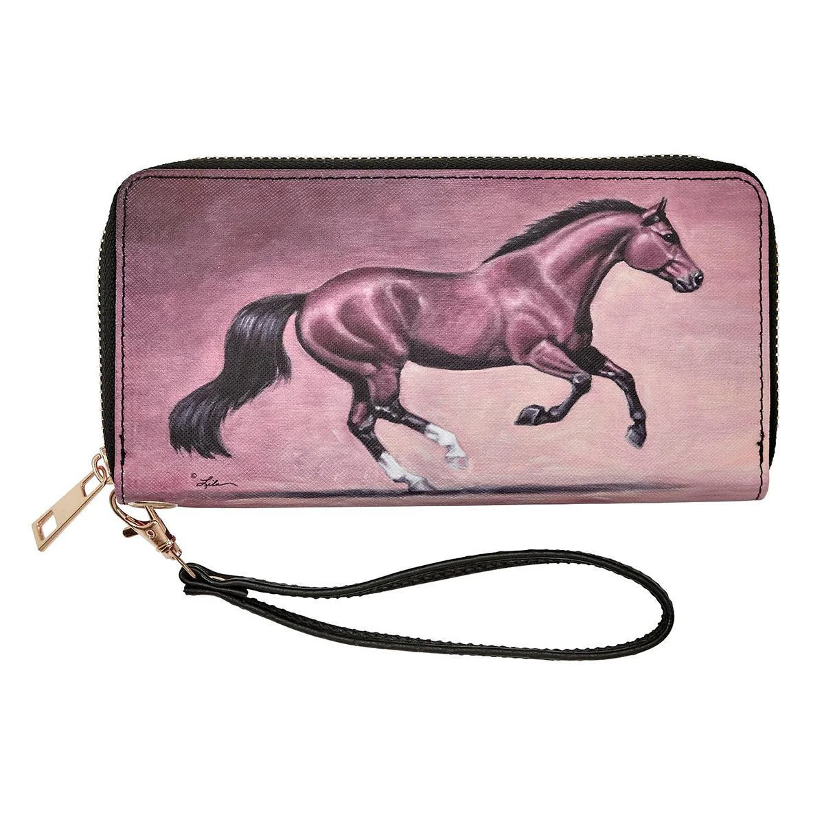 This is the perfect gift for all fashionable Equestrians! This zippered wallet with wristlet includes three inside compartments along with two bill fold slots and eight credit card slots. There is also plenty of room for a mobile phone!