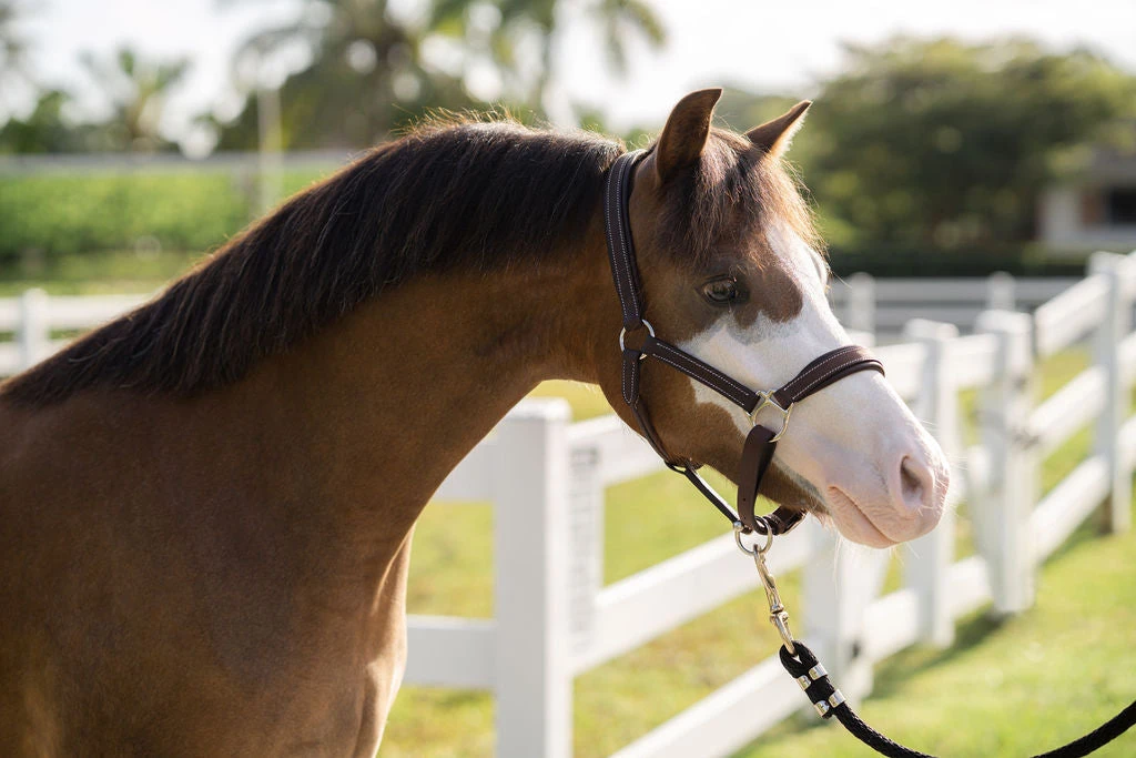 Gorgeous 1” leather halter with soft padded crown, cheeks and nose. Raised fancy stitch on cheeks and nose. Stainless steel hardware. Double buckle crown, round throat with snap. Adjustable noseband.