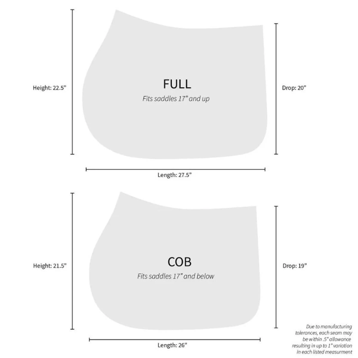 Not only are these pads beautiful to look at, but they are impeccably crafted by their manufacturing partner. No detail has gone overlooked, from the dirt-repelling top layer, the non-slip underside, and soft yet substantial padding. These pads are incredibly high quality and built to perform! The Full size is ideal for saddles 17″ and up, and the Cob size will work for saddles 17″ and under.