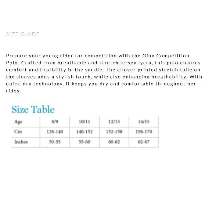 Prepare your young rider for competition with the Giuv Competition Polo. Crafted from breathable and stretch jersey lycra, this polo ensures comfort and flexibility in the saddle.