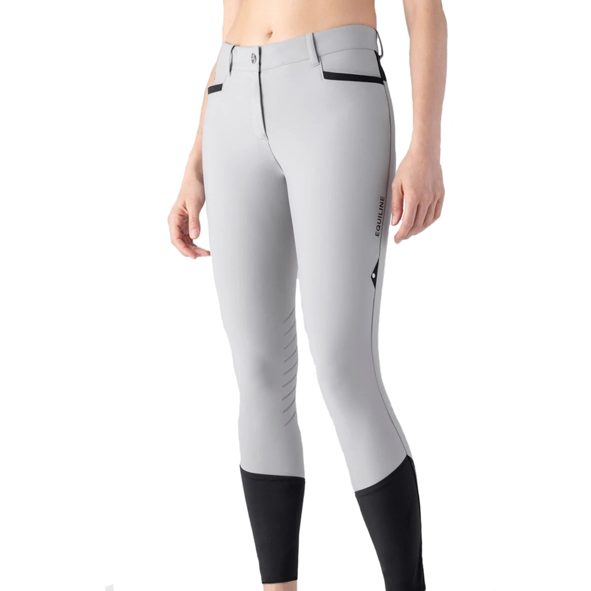 The Cepik Knee Grip Breech features a high-performance stretch fabric with breathable microhole detailing and ergonomic cuts for maximum comfort. The bottom leg is secured with a stretch fastening system and the knee grip system provides extra stability. The sleek black design is adorned with a printed Equiline logo on the front pocket and leg for a subtle yet stylish touch.