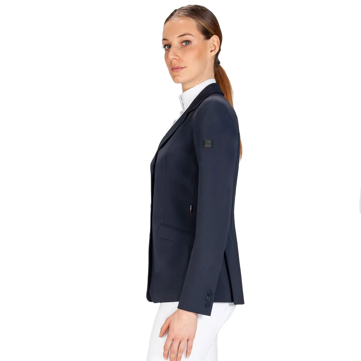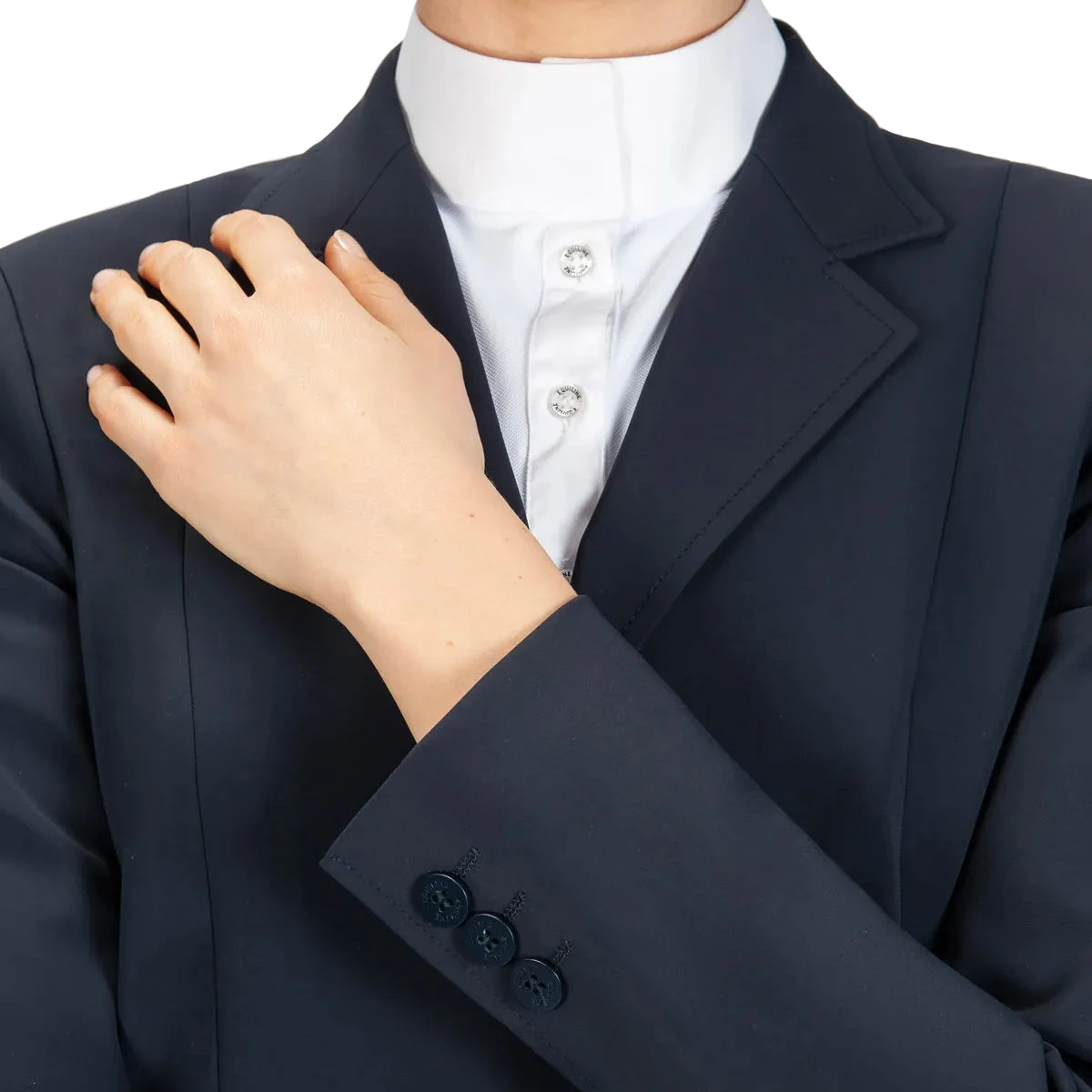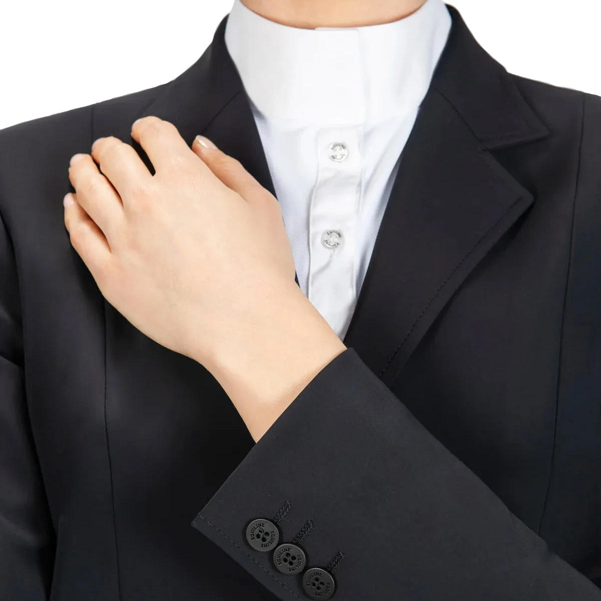 The coat boasts Equiline’s proprietary X-Cool Evo 4-way stretch fabric, which allows for enhanced breathability and freedom of movement. The lightweight feel makes it ideal for equestrians competing in hot weather climates. Additional features include discreet branding, a double vent in the back, faux flap pockets in the front, and flat matte buttons.