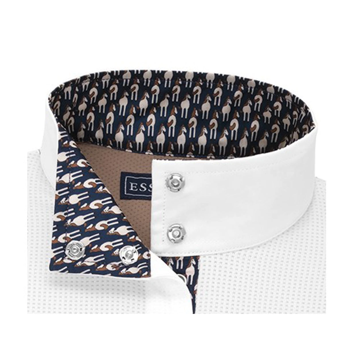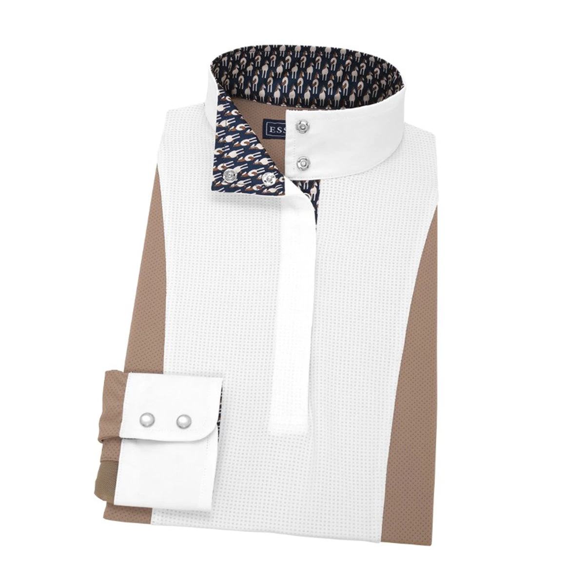 Luna Hunter Performance show shirts artfully combine the classic good looks of a crisp white shirt in the show ring with a colorful appeal. Paired with a show coat, the white front panel, collar, and cuffs make a crisp, clean presentation in the ring. Without a coat, the color body provides a flattering feminine silhouette and the practical advantage of staying clean throughout the day. Expertly tailored of high-performance, moisture-wicking fabric with all the fine details you expect from Essex Classics.
