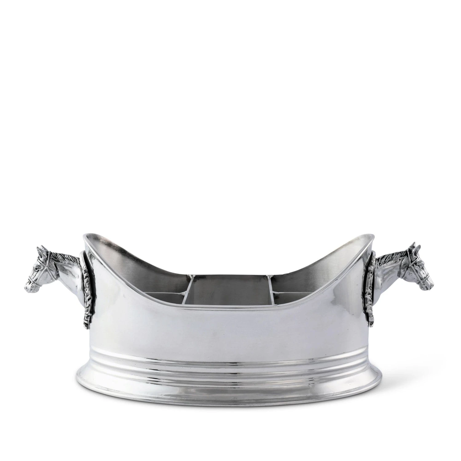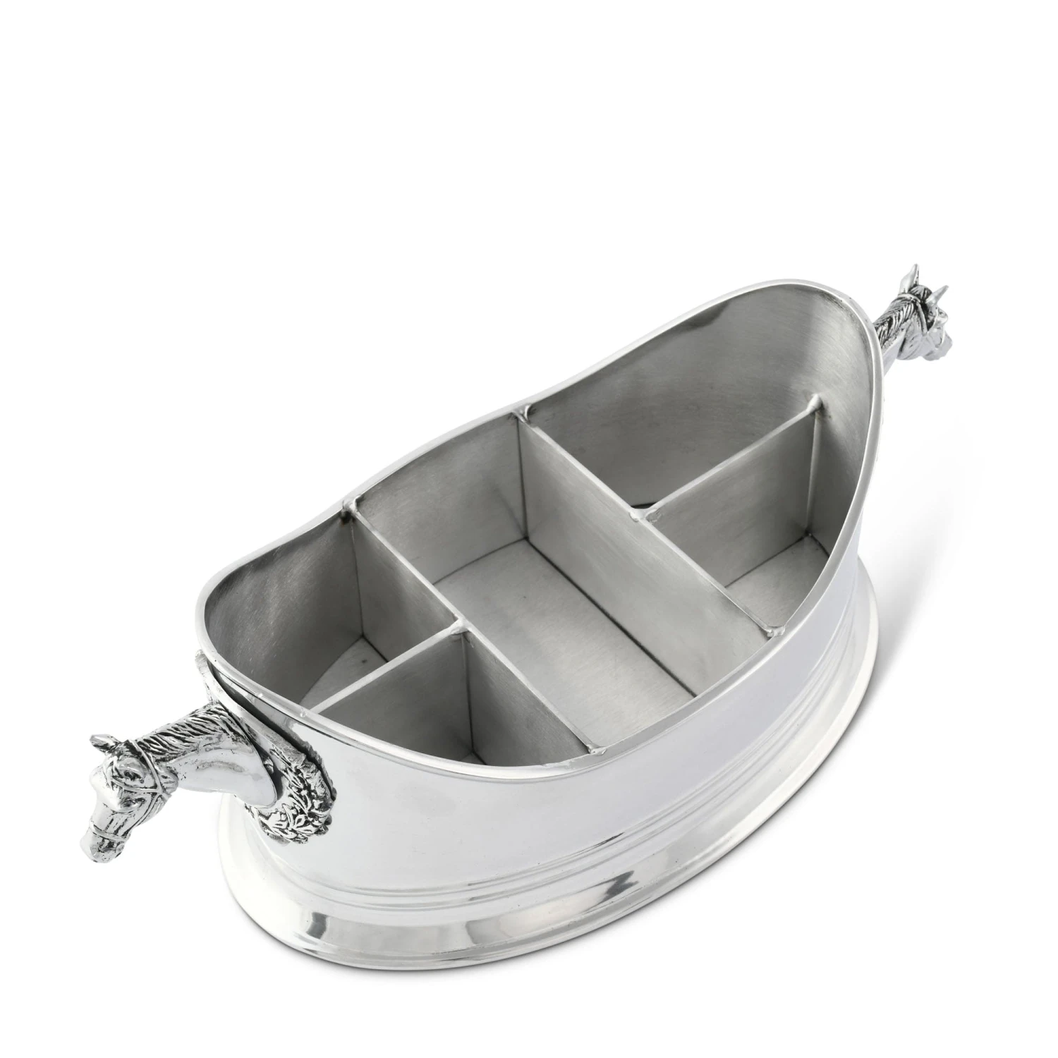Accessorize your kitchen countertop or buffet table with this five-compartment horse head silverware caddy handcrafted from lightweight, tarnish-proof aluminum. Or, use it as a desktop organizer to keep your essential office supplies within quick reach.
