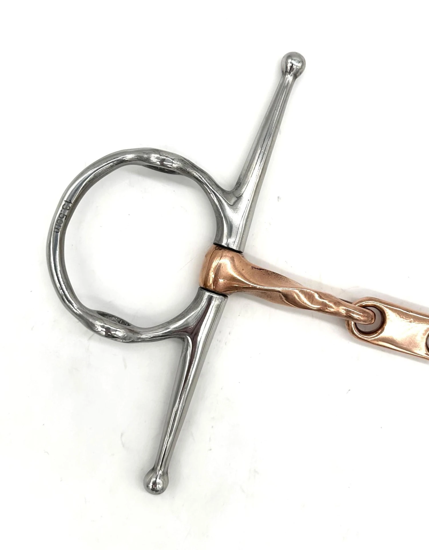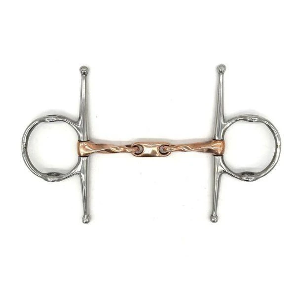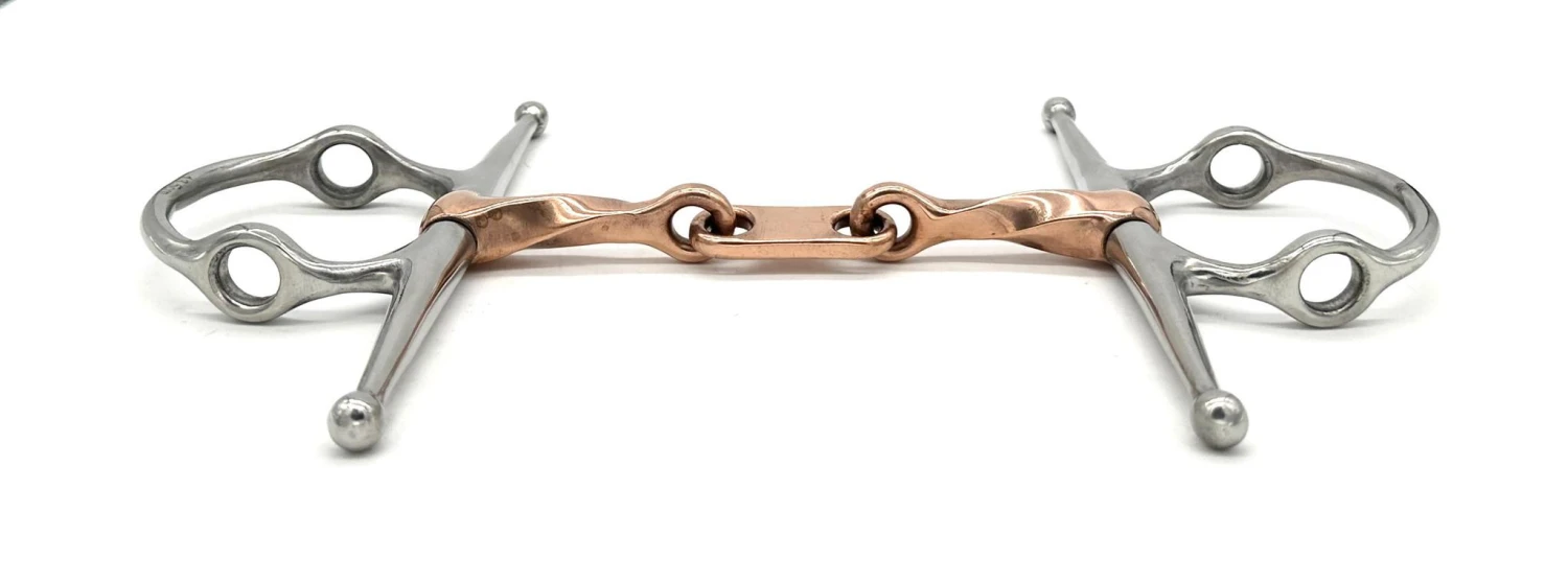 The Twisted Copper Nelson Gag with Dr. Bristol Link Bit combines a twisted copper mouthpiece for refined communication with a Dr. Bristol link for even pressure distribution. The Nelson gag design offers lifting action and lateral stability, making it ideal for horses needing improved head carriage, balance and turning guidance.
