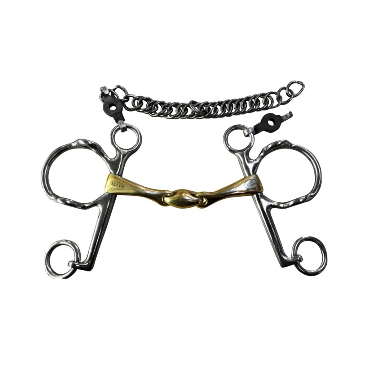 Tips: this Pelham bit can only be used with four reins by putting a pair on the gag cheek pieces and the other one on the Pelham bar. It is possible to use bit loops to reduce the action by putting them on the main ring and on the bar. Therefore, the curb chain action can be softened by using other curb chain types as leather or nylon ones.