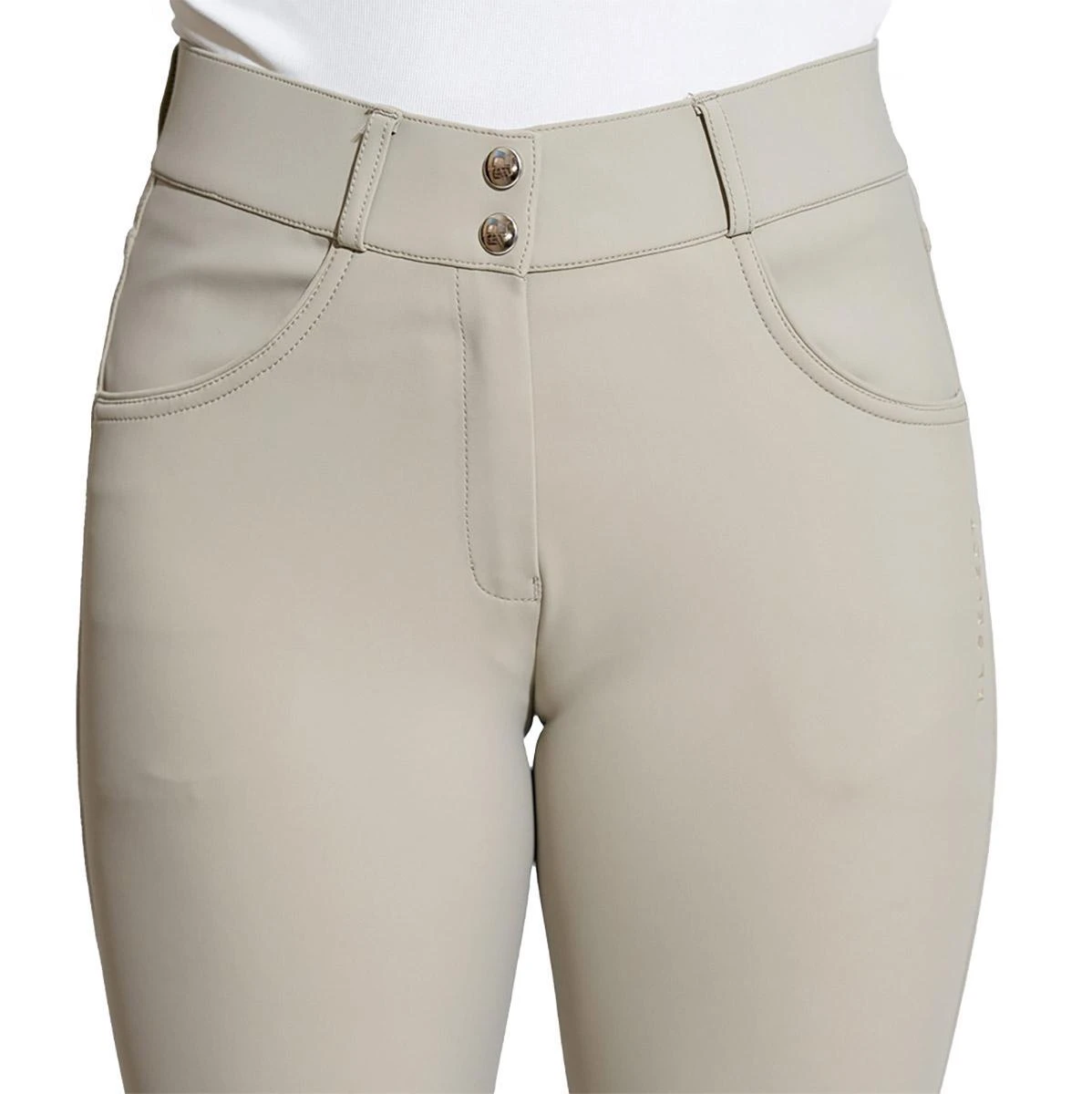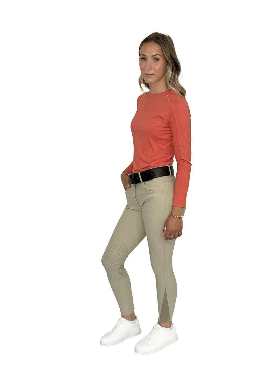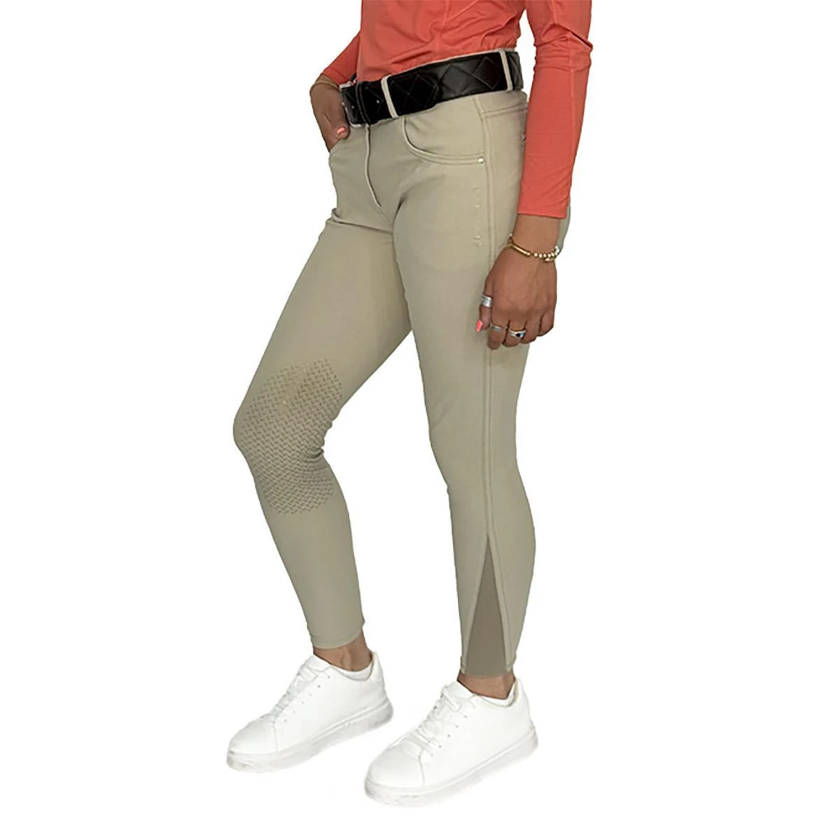 The new Gabrielle Breech features high-tech compression fabric with 4-way stretch for optimal movability and a sleek figure-flattering look! The mid-weight material offers breathability, moisture absorption, and fast drying. The Gabrielle’s features include two front slide in pockets accented by silver grommets, two decorative back zipper pockets, contrasting piping, a silicone full seat, and Lycra sock bottoms.