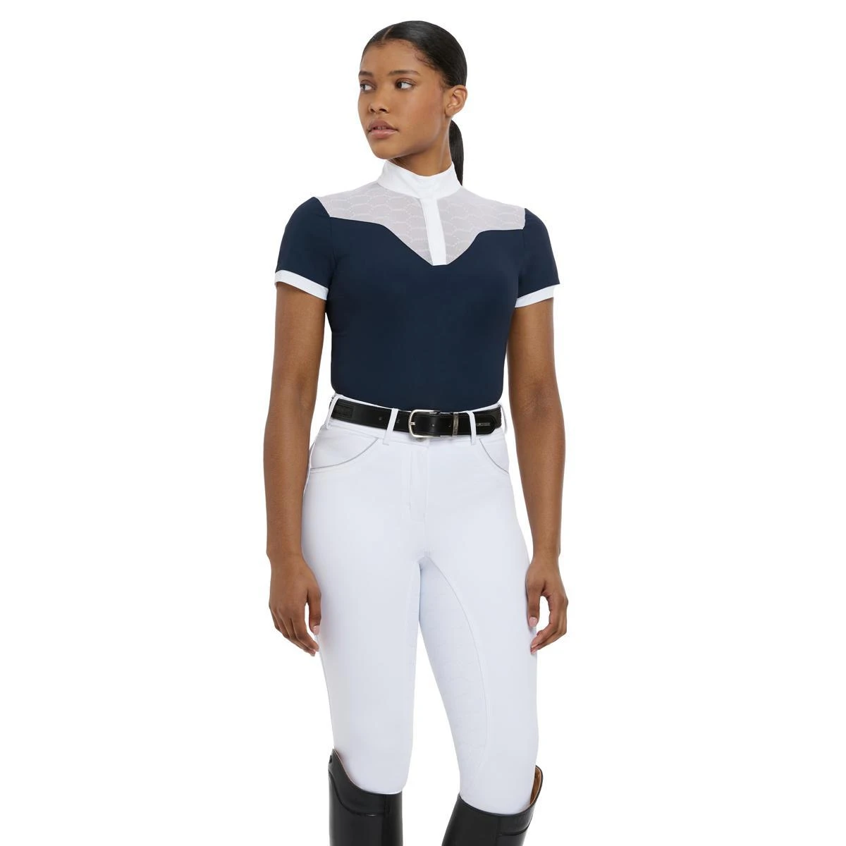 This competition shirt is ideal for performing at your best. It’s an elegant short-sleeved under layer designed in performance fabrics. Cut with a flattering silhouette in lightweight breathable crepe fabric, it has soft mesh under the arm to keep you cool and comfortable. Feminine LeMieux-pattern flocked mesh covers the chest and back panel for ventilation when the heat is on. The standing collar has subtle LeMieux branding and a magnet placket popper closure.