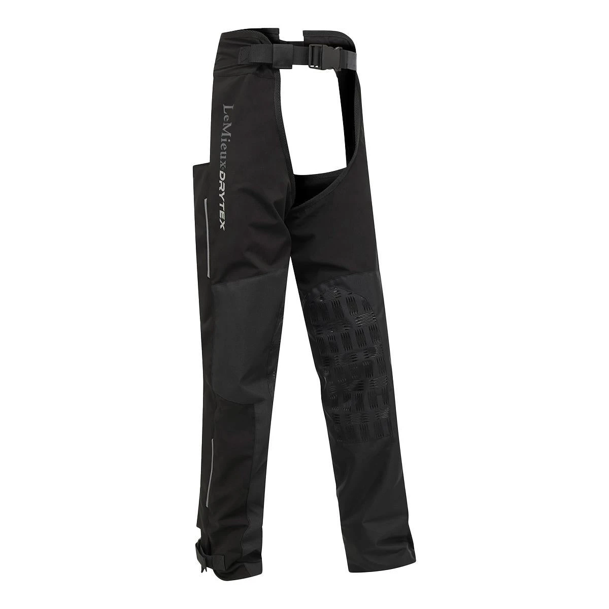 Elasticated foot straps stop the bottoms rising up whilst riding and the silicone knee grips ensure stability in the saddle. Reinforced knees and inner lower leg give added durability making sure these chaps withstand the hard work of winter. Elasticated waist band gives a comfortable and secure fit and the hook & loop adjustments around the bottom makes getting them on over breeches or jeans easy. Finished with LeMieux DryTex detailing and a flattering fit.