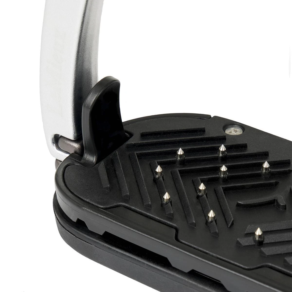 The ergonomic footplate of the Balance Stirrup is set at 5 degrees with a cross-track grip surface and mounted on an impact absorbing cushion layer of dynamic polymer with a 70% compression rating. Impact and vibrations are absorbed at the point of landing when jumping which reduces the fatigue to the knee and ankle and lowers the stress on leg muscles and tendons. The embedded hardened steel pins provide maximum security of the boot.