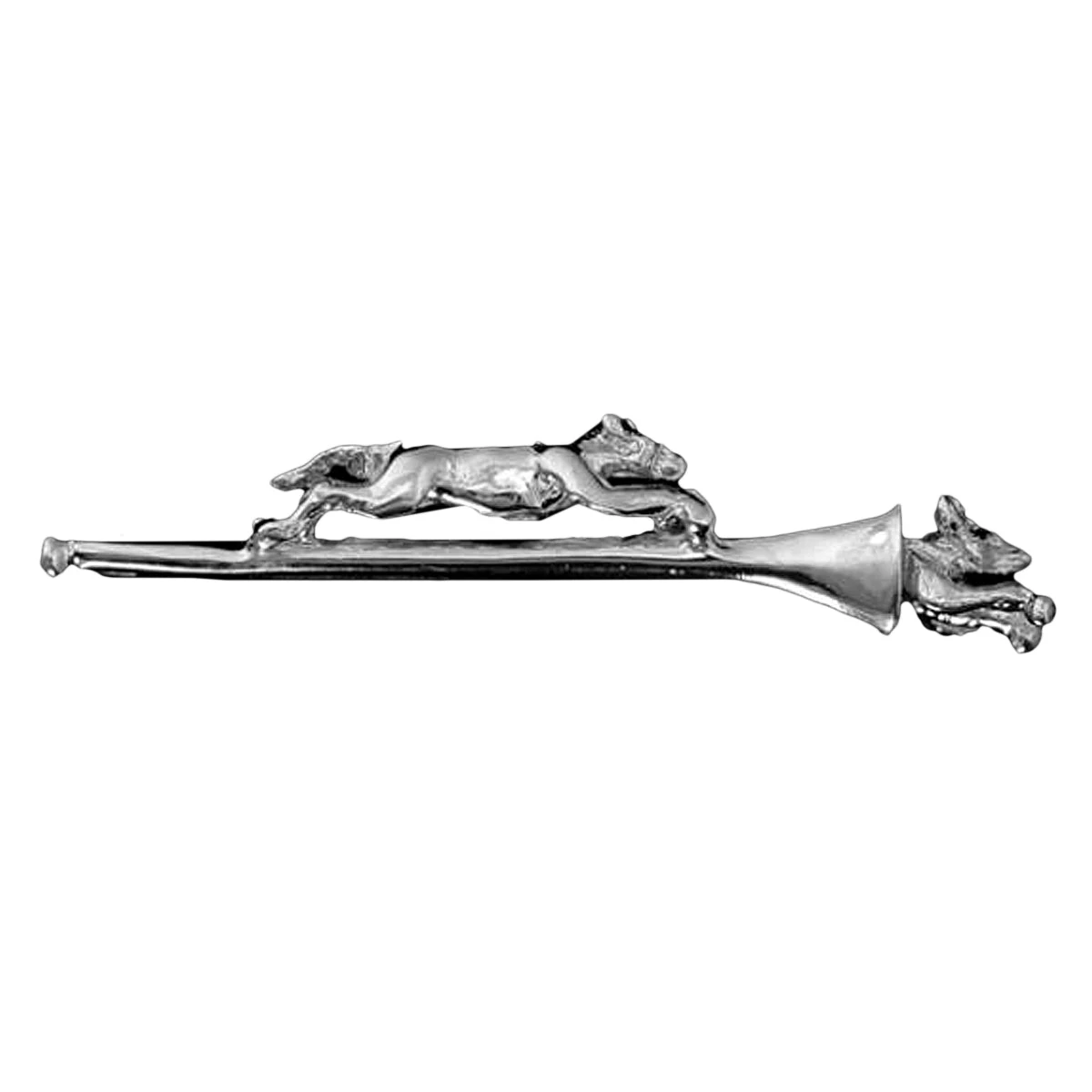 Our Stock Tie Pin Hunt Hound Chasing Fox is in ”Full Cry.” The hound pursues the fox along the hunt horn.