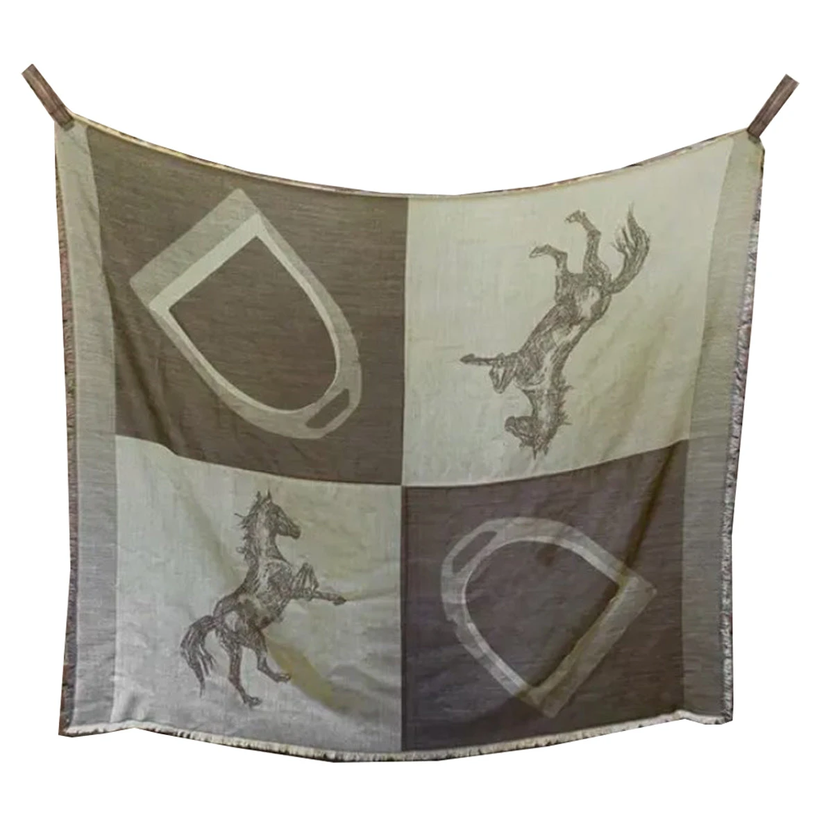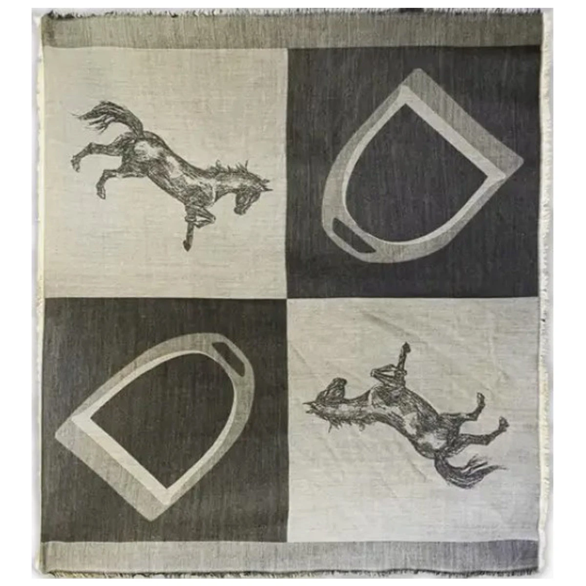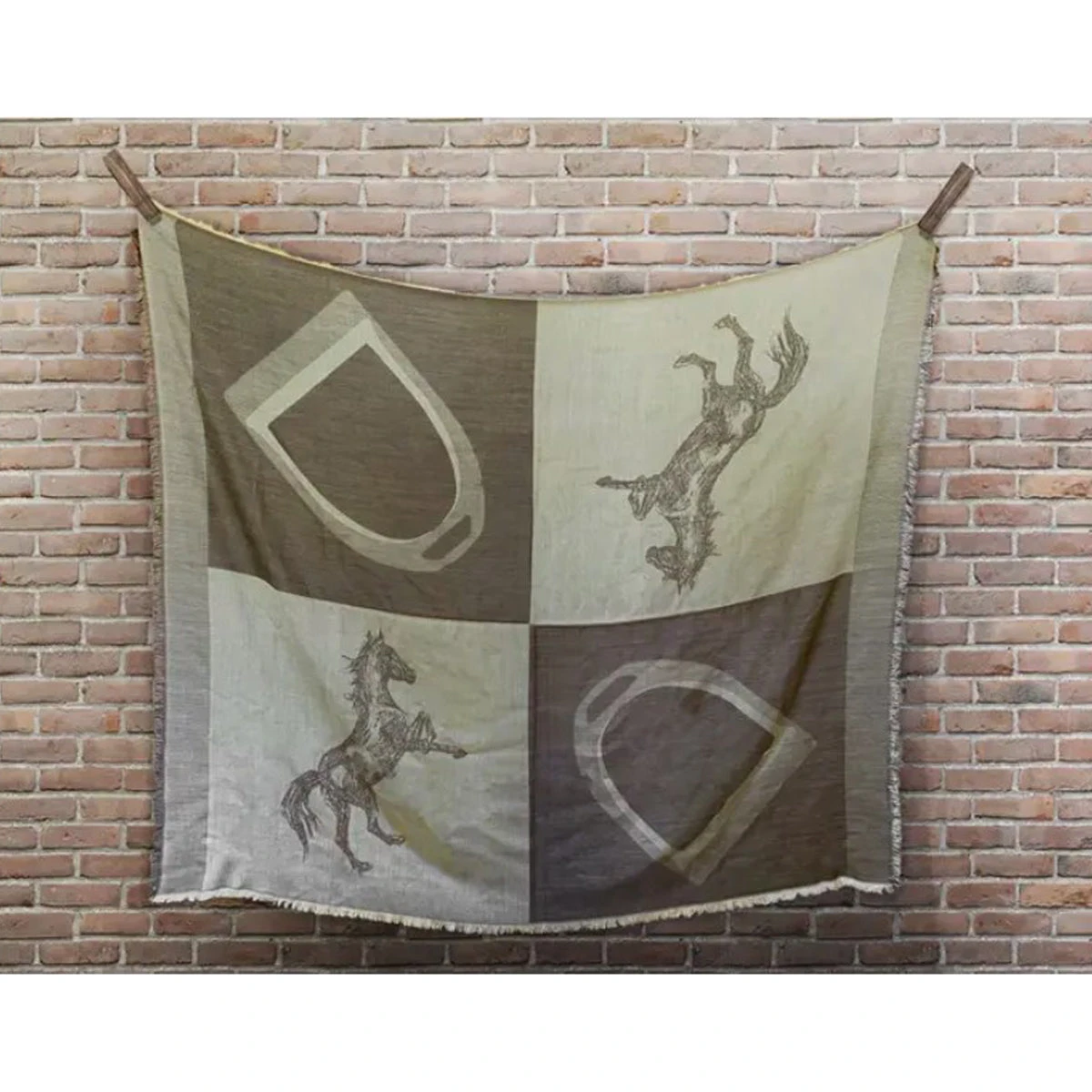 Our Blanket Scarves are made with 100% Premium Australian Wool. The premium wool offers natural hypoallergenic and temperature regulating properties and is so incredibly soft and light. The scarf features warm neutral tones, and the O&C prancing horse and stirrup.