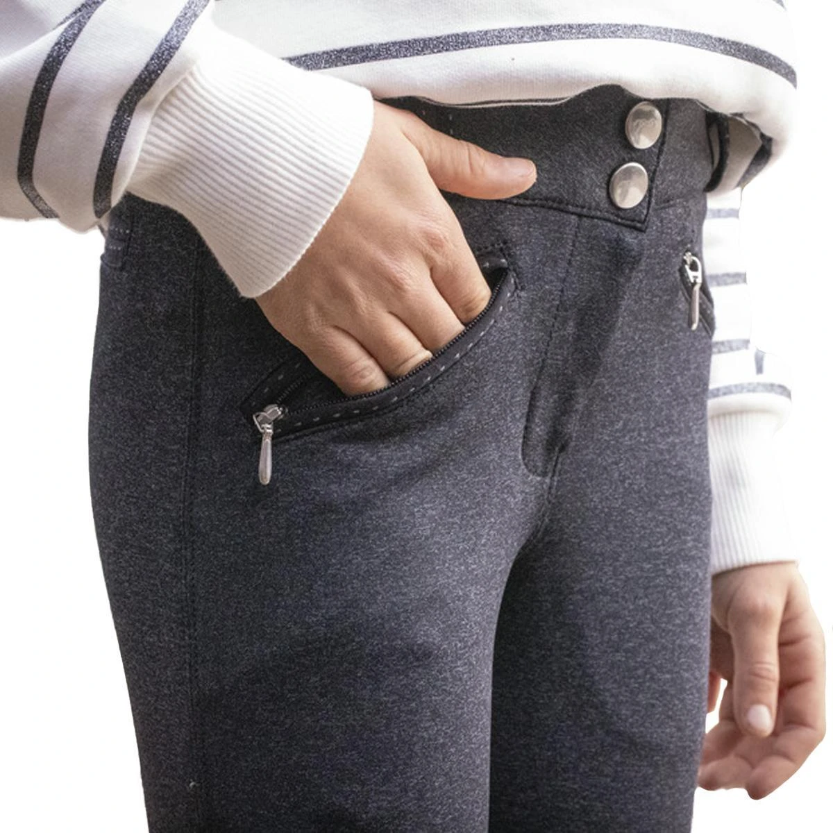 Part of the Eden by Pénélope Collection. The heather gray Romy breeches for children are extremely comfortable thanks to their particularly stretchy, close-fitting fabric. They feature two front zipped pockets and a slightly wide, snug-fitting waistband. Its Lycra lower legs adapt to a wide range of body shapes. Its original heather gray color will cause a sensation at the stables.