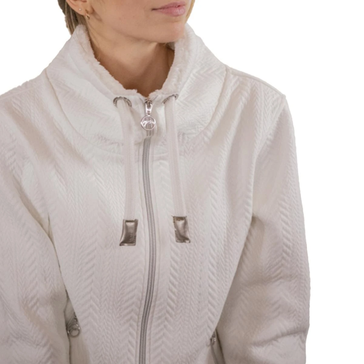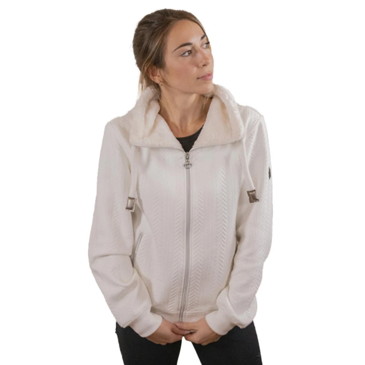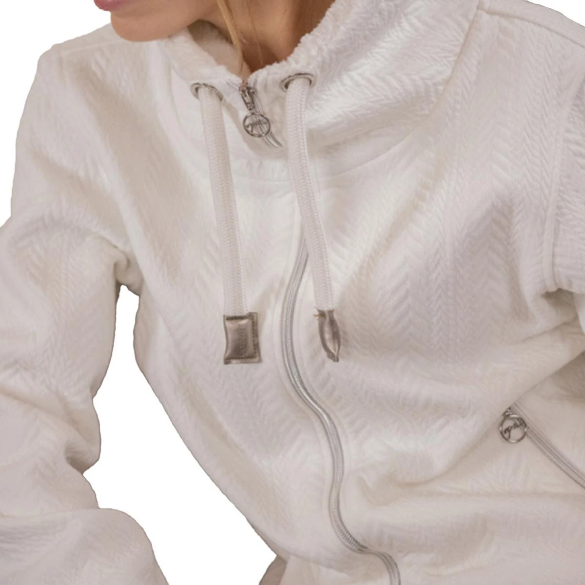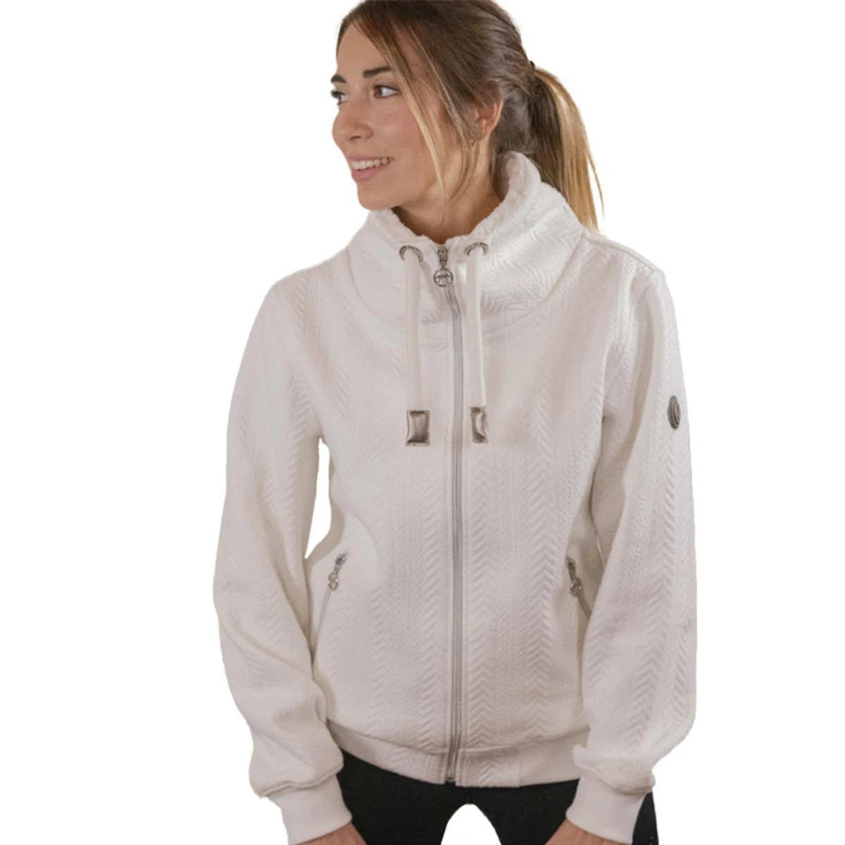 This thick sweatshirt has a front zip closure and a large fleece-lined collar for added warmth. Crafted from a lightly textured chevron fabric, it also features two zippered pockets and a small chrome-colored Penelope logo on the left sleeve. Perfect for both city outings and post-stable lounging, this ecru sweatshirt is perfect for those cold days.