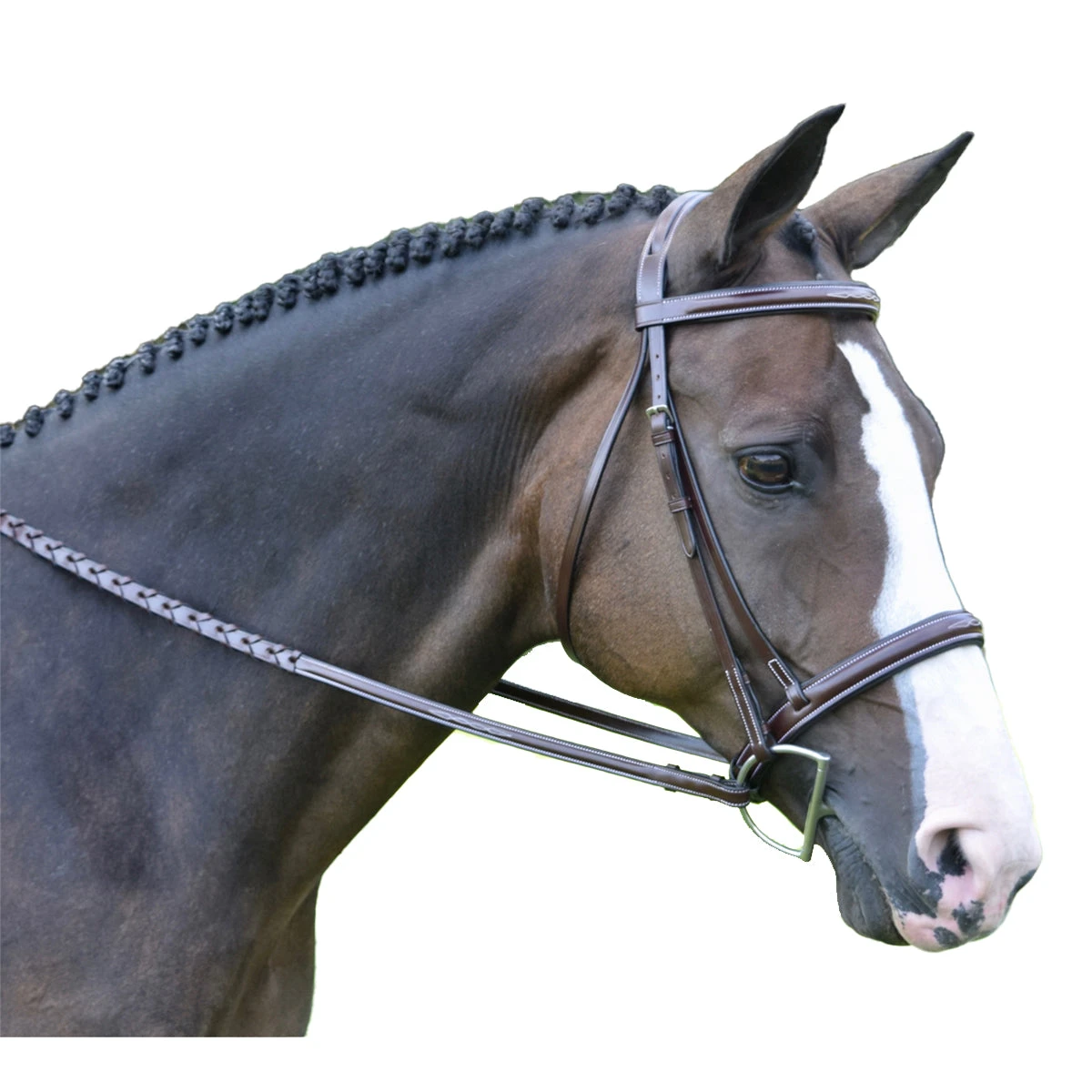 All hardware is stainless steel, with hook stud ends and a roller buckle on the noseband. This bridle is made of the finest Grade A English Sedgewick’s leather.
