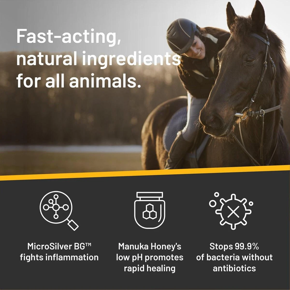 The first product to combine the natural power of Manuka Honey and MicroSilver BG®, Silver Honey® Rapid Wound Repair is equine wound care that’s tough on bacteria but gentle on skin. Its revolutionary formula moisturizes the treatment area as it heals and is proven to stop 99.9% of bacteria immediately to start healing faster.