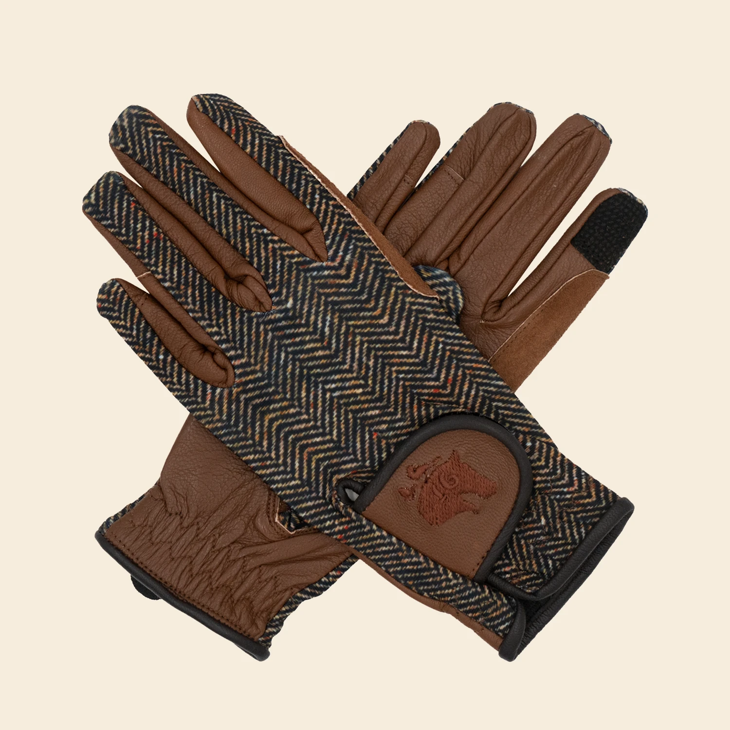 Our signature Herringbone tweed in performance stretch top with cognac leather palms.Â