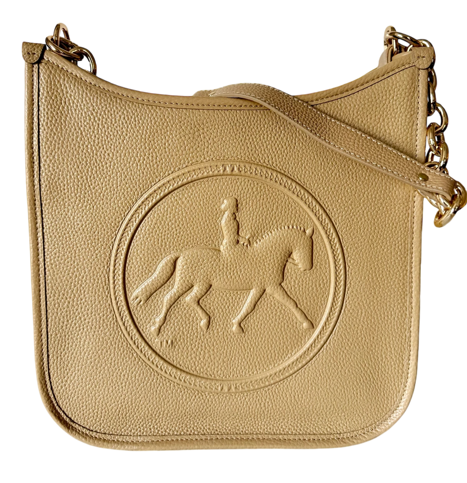We love this Middleburg Messenger in Dressage, a luxurious handbag inspired by Middleburg, VA, the Nation’s Horse and Hunt Capital. Crafted from pebble grain embossed leather with gold hardware, it offers a sleek look in black or camel. Inside, a vanilla-lined interior features multiple pockets for organization, while the magnet close ensures secure access. Customize with optional chunky gold chain or adjustable crossbody strap. Plus, it perfectly fits the Wellington Wristlet, combining style and practicality for everyday elegance.