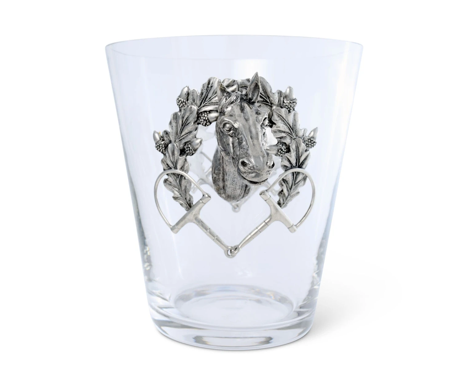 We pay homage to the noble racing steed with the pure-pewter accents on Vagabond House’s Horse Head Glass Ice Bucket. Acorns and leaves form a partial wreath around each thoroughbred as their heads extend into handles.